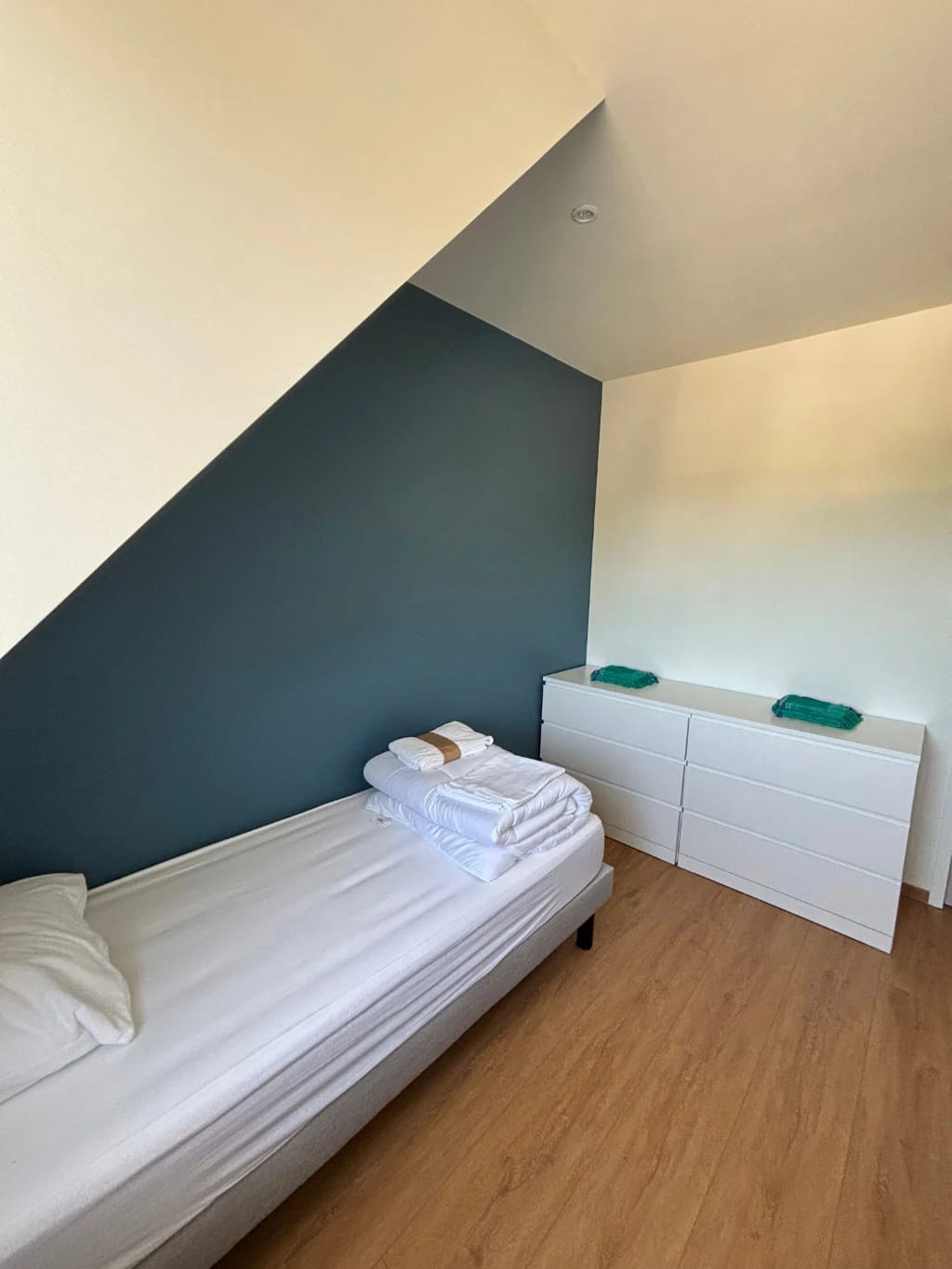 Upstairs, you’ll find 2 bedrooms: one with a 160 cm bed, the other with two 80 cm beds. Bed linen and towels are provided, so you don’t need to bring your own. The bathroom has a washbasin, shower and wall-hung WC.