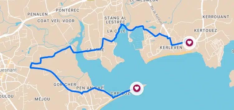Situé à environ 13 km du camping, ce circuit est parfait pour les cyclistes plus expérimentés, ou ayant une bonne condition physique. La route vous emmène à travers les paysages pittoresques de La Forêt Fouesnant et Fouesnant, alternant entre 6 km de pistes cyclables et 6 km de charmantes ruelles.